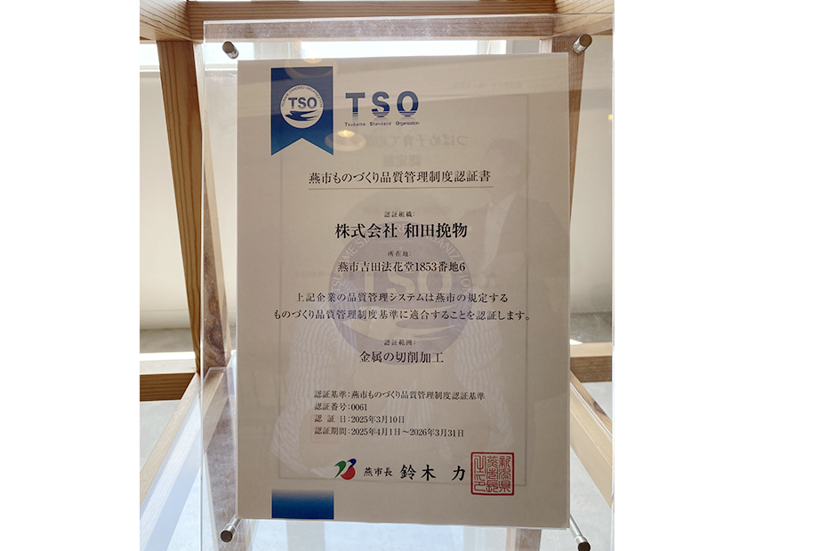 品質管理の強化策として、商工会議所の支援を受けながら燕市ものづくり品質管理制度(TSO)の認証を取得した。