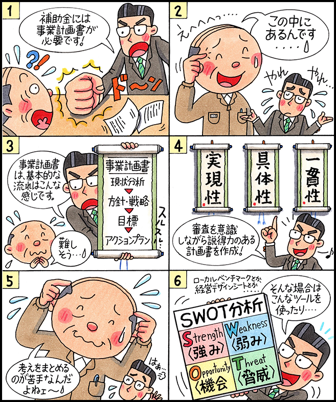 これまでしっかりとした事業計画を作ったことがない事業者もいるかもしれません。その場合、頭の中を整理する方法として「SWOT分析」や「経営デザインシート」などのツールを活用すると良いかもしれません。これらのツールは、「どのように課題を整理すべきか」、「どのように戦略を考えるべきか」といった視点を提供してくれるため、納得感のある事業計画書の作成に役立ちます。
